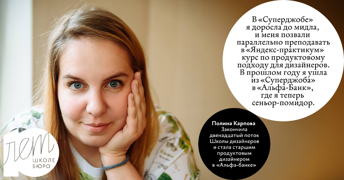 Полина Карпова закончила двенадцатый поток Школы дизайнеров и стала старшим продуктовым дизайнером в «Альфа‑банке». Полина рассказывает свою историю: «Я закончила Школу дизайнеров в 2020 году. На первой ступени я не верила, что смогу закончить даже её. На тот момент моей дочке было 2 года, и я думала, что не смогу заниматься и ребенком и учебой. Но смогла. Я успешно закончила все три ступени и весело потусовалась на выпускном. Кстати, на самом выпускном я обменялась контактами с продактом „Суперджоба“. И уже через 10 дней после выпуска был мой первый рабочий день в роли младшего продуктового дизайнера. В „Суперджобе“ я доросла до мидла, и меня позвали параллельно преподавать в „Яндекс‑практикум“ курс по продуктовому подходу для дизайнеров. В прошлом году я ушла из „Суперджоба“ в „Альфа‑Банк“, где я теперь сеньор‑помидор. Все эти годы я помню все фишки переговоров и редактуры, рассказываю всем про правила внутреннего и внешнего, и всё остальное, что намертво впечаталось в мою дизайнерск