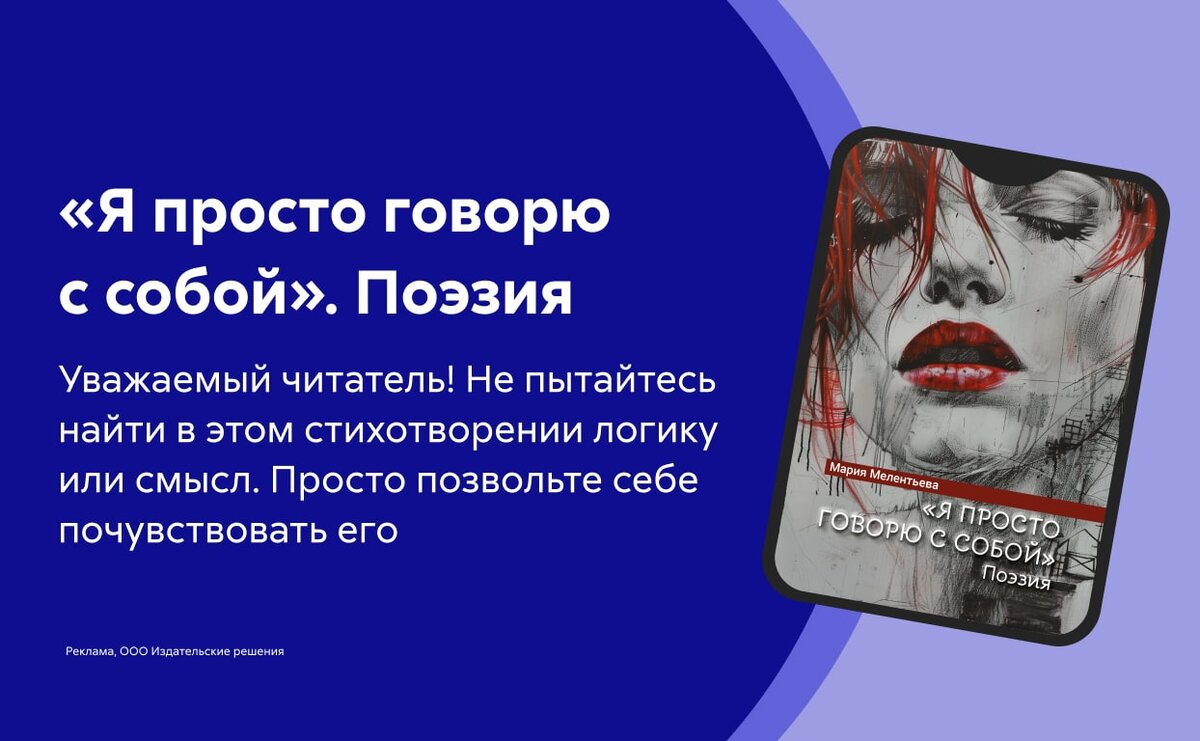 Трудное детство, потеря отца и проблемы с матерью, все это заставило автора, Марию Мелентьеву, учительницу и глубоко творческого человека, выплеснуть всю свою боль и переживания на страницах поэтического сборника «Я просто говорю с собой». Необычные, яркие и эмоциональные строки затрагивают самые тонкие струны души и будут близки многим читателям. Опираясь на своих любимых поэтов-акмеистов, таких как Сергей Городецкий, Анна Ахматова, Владимир Нарбут, автор выводит в своих стихах человеческие пороки, радость, горе и несправедливость с помощью тонкого психологизма и самобытного стиля. Книга погружает в самые потаенные уголки души автора и даёт прочувствовать читателю всю гамму эмоций, переполнявших поэтессу на протяжении жизни: от счастья и борьбы до печали и страданий. Сборник стихов «Я просто говорю с собой» – это живые и откровенные строки, проникнуть в которые можно именно через чувства и эмоции. Непростая биография автора и ее увлечение психологией нашли свое отражение в этом неболь
