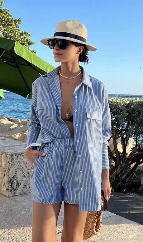 Помимо того, что пижамный костюм можно носить вместе, также мы можем его разделять или добавлять под рубашку первый слой в виде футболки, топа или верха от купальника, который точно не стоит игнорировать, потому что именно он подарит вам еще 5 новых сочетаний. Это будет выглядеть вполне уместно и при этом стильно, поскольку, напоминаю, мы с вами собираем пляжную капсулу.