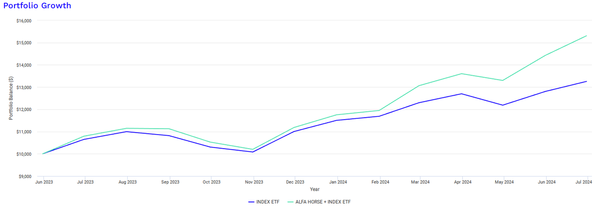 В прошлом году в июне я показал на одном из разборе портфель, который получалось составить из тех эмитентов в США, которые мы уже разобрали в качестве добавления к индексному фонду, как я недавно назвал - это "слабая" форма использования АЛЬФА-СКАКУНОВ. Проверка весьма тривиальна - если результат портфеля будет лучше индекса, то такой подход генерит альфу. Интересно было и то, что это уже получался не бэк-тест. Портфель я завёл на Portfoliovisualizer и теперь за ним легко следить.