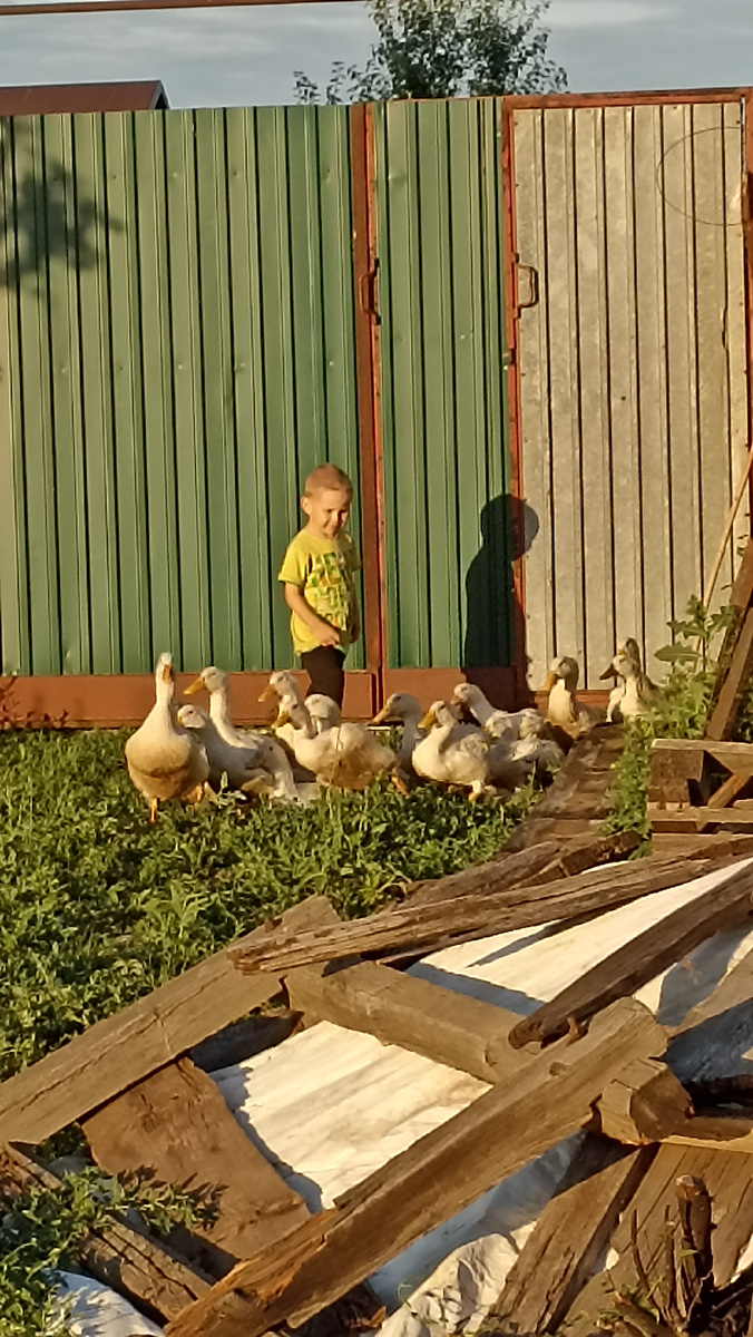 В отпуске каждый день кажется воскресеньем. А в воскресенье что нужно делать? Правильно! Отдыхать. Вот и мы сегодня отдыхаем. Почти. Не все. И не целый день, но всё же. Вечером, как всегда у Владика, была куча дел. И в песке надо было поиграть, и на качелях покачаться, и Нору выгулять. Но самым главным занятием было погонять соседских уток. Чем он пол вечера и занимался. Домой зашли, ребёнок попросился в баню. Её топили накануне, вода была теплая. Взяли полотенце и пошли мыться. Дома перекусили, посмотрели мультик и спать. *** Утром мелкий проснулся в 7. Минут 20 повалялись, встали. Владик поел гречку и сэндвич, я кофе с сэндвичем, муж свои любимые пельмени. Запустили стирку, посудомойку, робот пылесос и хлебопечку на замес дрожжевого теста. В холодильнике, после окрошки, остался кусок колбасы, надо утилизировать. Сыр и хвостик копчёной колбасы нашлись там-же. Пока тесто подходило, покормила, попоила цыплят. Мелких стали выпускать на улицу в выгул, вот уж они не нарадуются