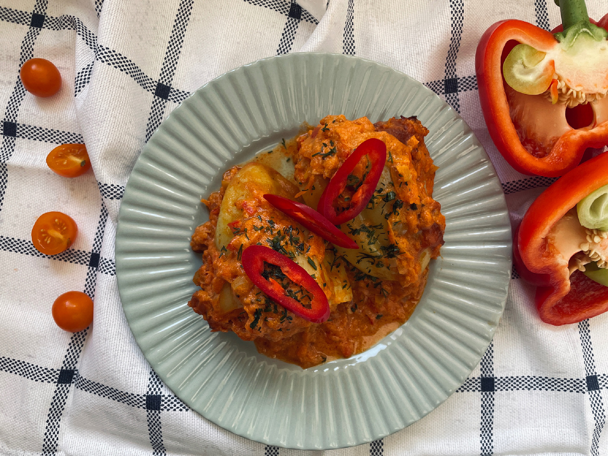 - Возращаемся к пассеровке для соуса. Обжариваем перец, который мы предварительно нарезали кубиком. Добавляем оставшуюся часть лука и моркови. Туда же добавим томатное пасту с небольшим количеством воды. Хорошо размешиваем, добавляем сахар и соль. После того, как аромат раскроется, заливаем сливки, для аромата добавляем прованские травы и лавровый лист. Тушим так буквально пару минут. Отставляем.