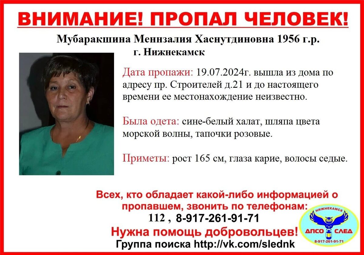 В Нижнекамске пропала 68-летняя Меннзалия Мубаракшина. Ориентировку в своих группах в социальных сетях разметили волонтеры добровольного поисково-спасательного отряда «След».