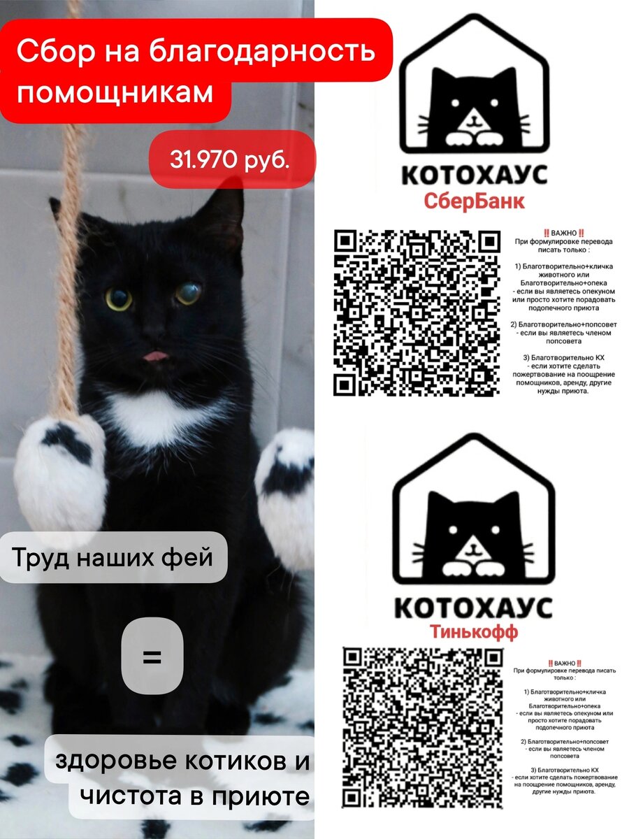 ❗Сбор на поощрение помощников за чистоту в КотоХаусе❗ Три дня мы отдыхали от сбора: суббота, воскресенье и понедельник. Посчитали сколько мы должны собрать на благодарность помощникам приюта и немного расстроились😣 С прошлой недели перешёл "минус" сбора суммой в 5.970 рублей, а до конца этой недели надо собрать ещё 26.000 рублей... ❗3⃣1⃣.9⃣7⃣0⃣ рублей ❗ Это не просто цифра - это спасибо за ежедневную чистоту и порядок в приюте, за каждодневное внимание к нашим подопечным. 🧼❤🩹😺 Сумма сбора - не подъёмная для одного, двух и даже трёх человек... Но нас с вами МНОГО❣️ Вместе с вами мы справимся❤🔥 Просим вас о любой помощи: 🔸пожертвования 🔸 репосты 🔸 участие в опекунском и попечительском совете на постоянной основе Актуальна любая помощь по вашим силам❗ Каждое пожертвование важно, будь это 10, 50, 100 рублей! Совместными усилиями мы сможем справиться❣ Пожалуйста, ПОДЕЛИТЕСЬ ЗАПИСЬЮ с друзьями, коллегами, всеми, кто не пройдет мимо😿 ‼ВАЖНО‼ 💠 По возможности пожертвования