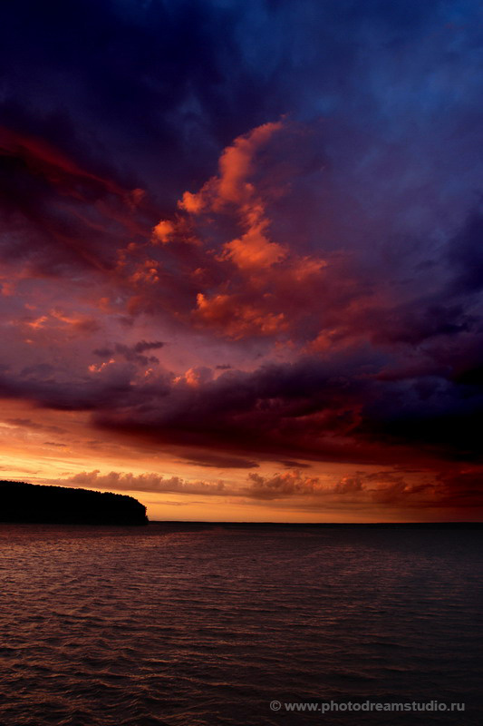 Здравствуйте! Ещё одно фото из походов на яхте по Нижнекамскому водохранилищу: Не правда ли, явно прослеживается неравнодушие автора данных строк к творчеству Альбрехта Альтдорфера?! Между прочим, когда я в последний (крайний) раз был Эрмитаже, то на вопрос: а есть ли в собрании Эрмитажа работы Альторфера? получил ответ (не от "бабульки-смотрительницы", а от НАУЧНОГО сотрудника) ответ примерно такого содержания: "не знаю. не слышал о таком..." Вот текстовый запрос по данной фотографии: последняя стадия заката. тревожное драматичное небо с тяжёлыми лилово-черными облаками с ярко-красными отблеска и заходящего солнца. в самом верху синее небо с темными тучами. линия горизонта расположена 30 процентов от нижнего края. нижняя треть кадра большое водохранилище с серой свинцовой водой. ветрено, на поверхности воды рябь и небольшие волны. слева вдали контур темного берега. солнце скрылось за горизонтом. А это - итоговая картинка: Как видим, у Искусственного интеллекта слишком умиротворительно