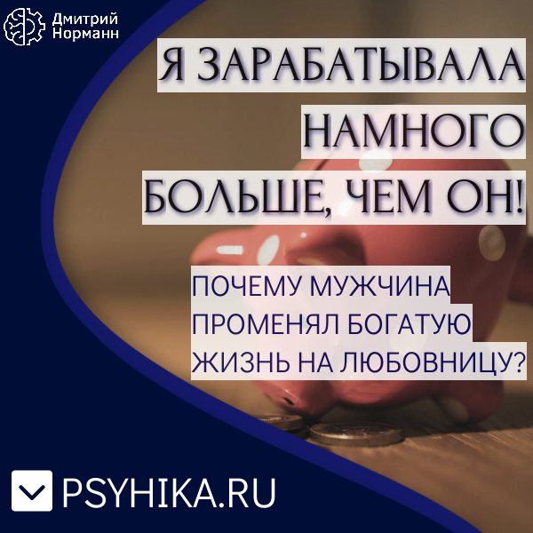 Почему мужчина променял богатую жизнь на любовницу? Я ЗАРАБАТЫВАЛА НАМНОГО БОЛЬШЕ, ЧЕМ ОН! Почему мужчина променял богатую жизнь на любовницу? Мужчине очень приятно чувствовать, что он мачо. Но это понятие довольно субъективное. Кто-то зарабатывает миллионы в месяц и себя таковым может не чувствовать, а кто-то зарабатывает 50 тысяч в месяц и чувствует себя таковым. Для мужчины важно понимание того, что деньги, которые он зарабатывает или то, что он делает, имеет значение для женщины и семьи. Он как бы спасает семью и понимает, что если он не будет зарабатывать эти деньги, то семье будет нечего есть. И эти деньги имеют для него огромное значение, потому что они для семьи имеют огромное значение. Мужчина, если он жил с женщиной, которая много зарабатывает, может уйти к женщине, которая вообще не работает. И он сам сразу начинает работать. И для него становится каким-то праздником идти на работу, потому что он является для женщины той опорой, о которой и женщины мечтают и мужчины хот