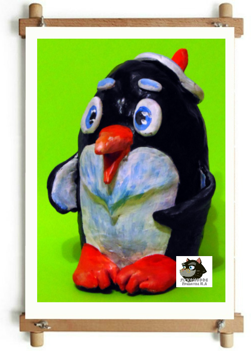 Банку переворачиваем вверх донышком, так чтобы её можно было одеть на кисть руки. Затем облепливаем тонким слоем пластилина, кроме верха. На верх банки устанавливаем пласты пластилина( примерно 1 сантиметр толщиной), и собираем их в купол. Это будет голова пингвина. Далее будем делать клюв пингвина. Берём небольшой удлинённый кусочек пластилина, сгибаем его пополам. Затем сплющиваем на кончиках, и вытягиваем в остренькую форму, примазываем клюв к голове. Лепим заготовки для крыльев-форма капельки, и грудки пингвина-треугольная форма. Овальные столбики для бровей, расплюснутые овалы для глаз, лапки в форме капелек-на них делаем надрезы стекой. Для шапочки понадобится колбаска и треугольная объёмная форма-конус. Прикрепляем все детали на свои места. Сглаживаем пальчиками все переходы между де