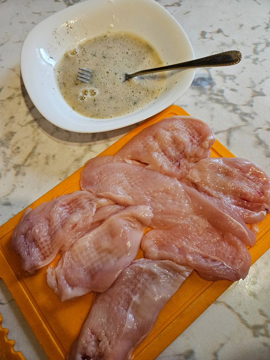 Когда времени практически нет, но нужно что-то приготовить, готовлю эти куриные отбивные в яйце. Готовятся они очень быстро, получаются вкусно и полезно. Всё что нам потребуется это: 1. Филе куриной грудки разрезаем вдоль на несколько кусочков, слегка отбиваем. 2. Яйцо взбиваем с солью, перцем и укропом (можно добавить другие специи по желанию). 3. Обмакиваем кусочки курицы в яйце и выкладываем на разогретую сковороду, слегка смазанную растительным маслом (я сковороду дополнительно застила пергаментом, чтобы использовать как можно меньше масла). 4. Обжариваем с двух сторон. Куриные отбивные в яйце готовы, можно подавать к столу с любимым гарниром. Приятного аппетита!