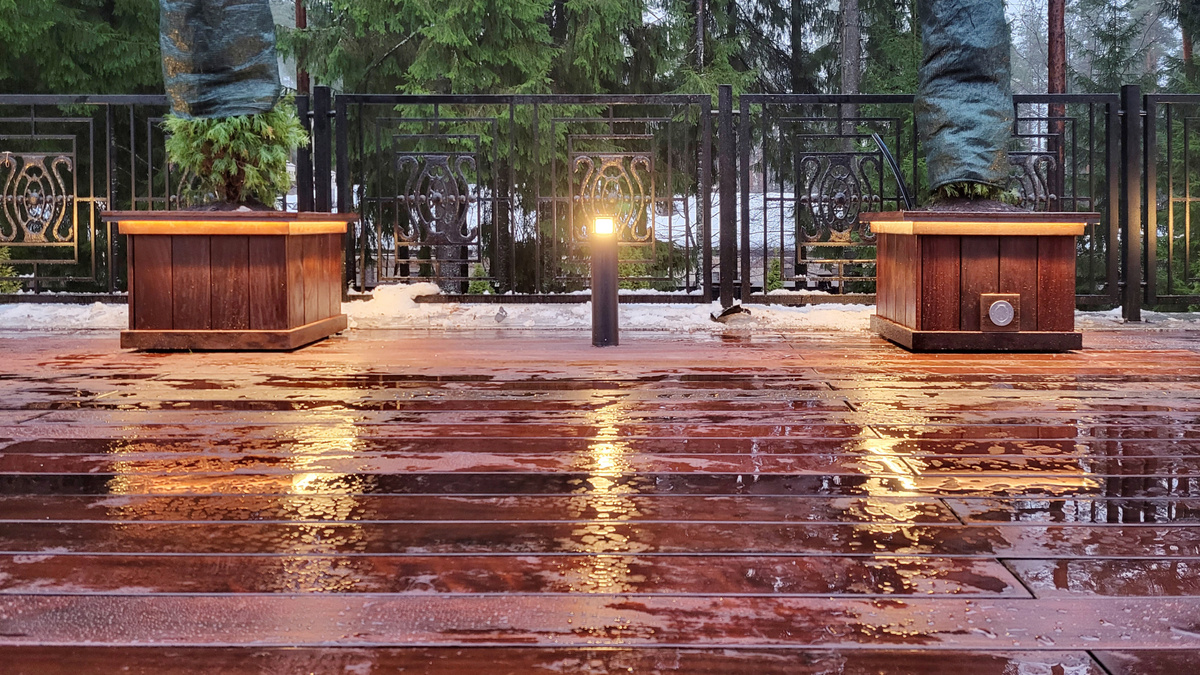 ⚠️ Для подобной террасы важно правильно подобрать древесину, из которой будут сделаны террасные доски. Не любая порода подойдет для такого проекта. Советуем остановить свой выбор на экзотических твердых породах. Такая древесина устойчива к постоянным перепадам температуры, к регулярному контакту с влагой и часто обладает природной способностью противостоять размножению грибков и паразитов.