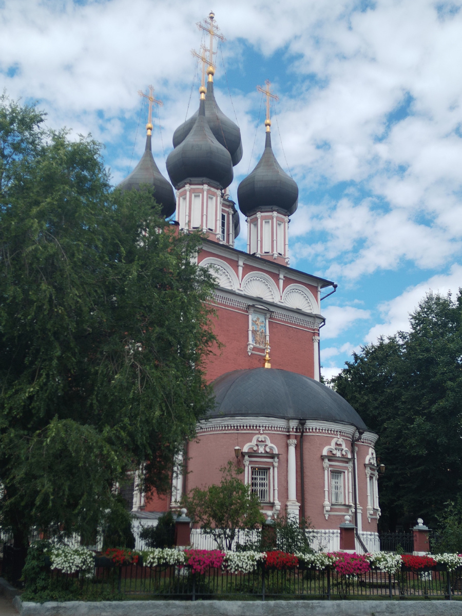 Нынче прогулка началась, как водится, с поисков места для парковки. Припарковались у церкви Ризоположения на Донской. Красива и сама церковь, и подвесные петунии на ограде. Церковь интересна тем, что построена в 1680 году, и не закрывалась даже в XX веке, что редкость. Среди ее святынь - икона Матроны Московской с частицей мощей (но сюда, в отличие от Покровского монастыря, к мощам не стоит многочасовая очередь) и придел великомученицы Екатерины. Так уж повелось, что я считаю эту святую своею покровительницей, хотя и не могу назвать себя православной христианкой.