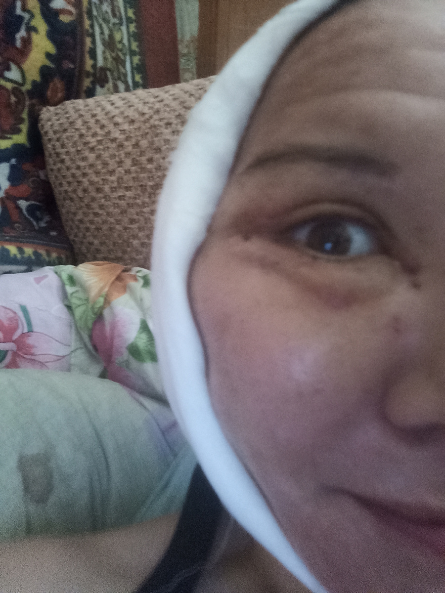 Эххх, зря хирурги не показывают будущим прооперированым, какими будут их лица сразу и несколько дней после. Ну я вот, честно скажу, очень испугалась. Это было главное чувство после операции. Даже несмотря на то, что доктор заверил, что все хорошо и все так и должно быть. Я вообще человек очень мнительный, я всегда сразу думаю о плохом и настолько могу в это поверить, что, как в анекдоте, "умру от опечатки". Я хочу всем рассказать о своём лице, чтобы такие же, как я, не умерли с испугу перед зеркалом))) Итак, лицо, обрамленное толстой бинтовой повязкой, было широкое, похожее на блин, глаза - узкие щели, под глазами - красно. И, что почему-то меня более всего напугало - швы. Да, швы, представьте себе))))))) Прям над и под глазами, ой, мамочки мои!)))) Нитки вжимались в отекшую кожу, и мне представлялось, что сейчас либо они прорежут ее, либо вырвут кусками. И ещё мне представлялось, как уже начал отмирать внутри моей кожи под повязкой тот загадочный SMAS слой.))))) И много мне чего ещ