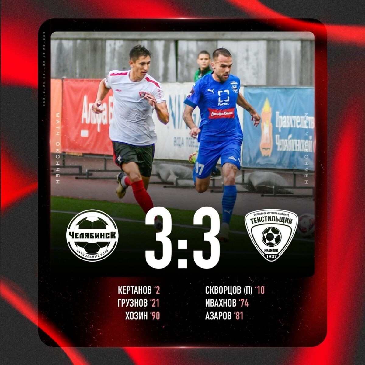 Настоящий триллер в столице Южного Урала выдали футболисты «Челябинска» и ивановского «Текстильщика». Зрители, пришедшие на стадион, увидели шесть забитых мячей. В первом тайме на второй минуте хозяева открыли счёт после точного удара Константина Кертанова. На 10-ой минуте ивановцы получили право на 11-метровый, который удачно реализовал Алексей Скворцов. Однако через 11 минут хозяева снова вышли вперёд после точного удара Ильи Грузнова. Нападающий «Челябинска» во втором тайме из героя стал антигероем. Он за пять минут получил две жёлтые карточки и оставил хозяев в меньшинстве. Ивановцы воспользовались этим и на 74-ой минуте Матвей Ивахнов один мяч отыграл, а на 84-ой минуте Владимир Азаров вывел их вперёд - 3:2. Отметим, что тренерский штаб «Текстильщика» угадал с заменами ибо оба футболиста, которые забили мячи во втором тайме, вышли на замену. Но удержать победу в матче «Тектильщику» не удалось. На 4-ой добавленной минуте в двадцати метрах от ворот был назначен штрафной удар, которы