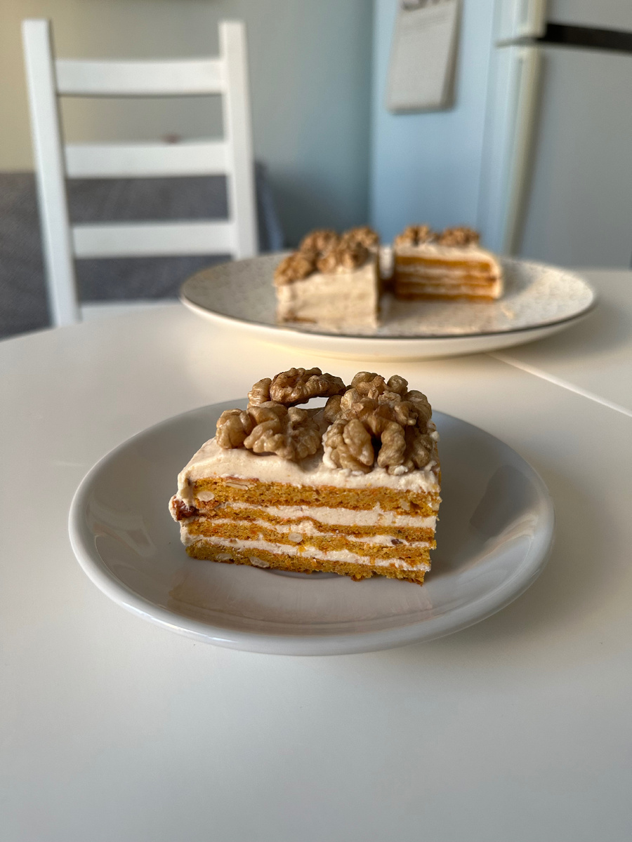 Я подумала, что воскресенье - отличный повод начать день с торта! И приготовила нам простой морковный тортик с вечера 🥰 дети рады 🔥 Корж: 140 г свежей моркови 100 г спелого банана 1 яйцо 40 г кукурузной муки 5 г разрыхлителя Щепотка корицы 10 г рубленых орехов Крем: 40 г фиников (вес без косточек) 200 г мягкого творога Способ приготовления: 1. Для коржа взбить морковь и банан. 2. Добавить яйцо, муку, разрыхлитель и корицу. Взбить до объединения ингредиентов. 3. Добавить орехи и перемешать. 4. Вылить тесто на силиконизированный пергамент. Разровнять. 5. В духовку на 180С на 18 минут. Дать остыть, снять пергамент. Подровнять края и разделить корж на 4 части. 6. Для крема взбить блендером финики и творог. Промазать коржи и убрать в холодильник на 8-12 часов и украсить орехами. Будете готовить?