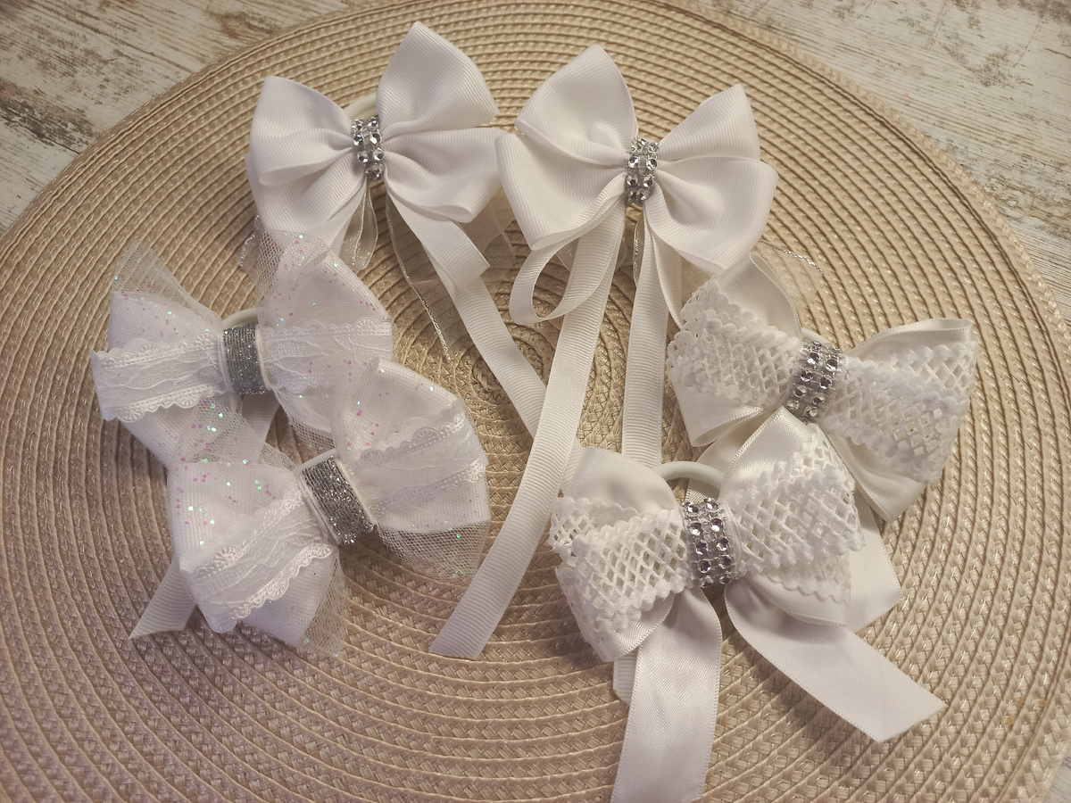 В ближайших публикациях буду делиться идеями простых бантиков на школьную тематику. В принципе если заменить ленты на другие оттенки, то получатся не только школьные бантики. Все размеры из расчёта на одно изделие. Вот такие изделия будут. Бантики из репсовой ленты с добавлением органзы. Понадобится: 2. Репсовая лента ширина 1 сантиметр 3. Лента органза ширина 4 сантиметра Собираю заготовки при помощи клея и нитки с иголкой. На основной заготовке банта нижняя часть намеренно чуть больше верхней части. Вы можете сделать одинаково. Короткие отрезки сворачиваю пополам и склеиваю. На длинных делаю косой срез. Короткие отрезы из ленты шириной 1 сантиметр сворачиваю пополам и склеиваю немного под углом. Теперь остаётся только собрать слои при помощи клея. С изнаночной стороны основной заготовки сначала приклеиваю заготовку из тонких репсовых лент. Затем заготовки из органзы. Приклеиваю резинку и декорирую по кругу лентой с имитацией страз. Можно использовать любую другую, например барха