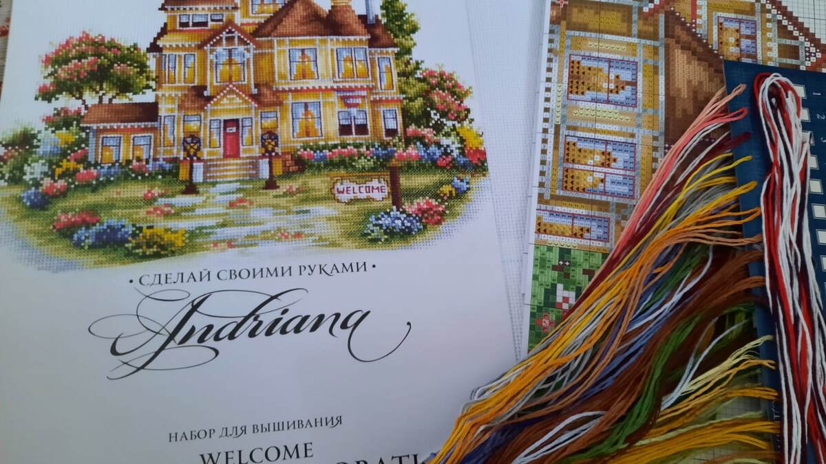 Доброго дня, дорогие вышивальные коллеги и сочувствующие! Кто-то загорает на пляже или на грядках, а я вышиваю. Тоже труд, особенно когда решил поставить реккорд своей активности, пусть даже вышивальной. Раньше как было, - хочу вышиваю, хочу - чай пью и смотрю как другие вышивальщицы о своих трудовых подвигах на полях канвы и в зарослях бэкстича рассказывают... А теперь приходится самой вкалывать... иголку в равномерку без выходных. Но шутки в сторону. У меня вполне серьезный отчет. Сегодня открываю новый набор от полюбившейся фирмы Андрианна ( Сделай своими руками) - "Добро пожаловать!" Яркий и вдохновляющий дизайн этого набора для вышивки не оставил и меня равнодушной. Загорелась вышить именно этот домик, чем-то он мне приглянулся. Состав набора безупречен, в этом Андрианна еще не подводила: канва всегда с запасом и идеально ровно отрезана, понятная и простая цветная схема, ниточки разложены в органайзере... В этот раз, правда, удивил пучок разноцветных ниток, лежащий отдельно... П