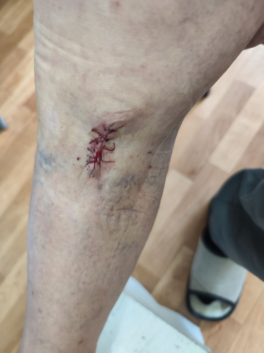 В предыдущей статье я рассказал вам о двух моих пациентах, оба из которых были пожилыми мужчинами с непростыми медицинскими случаями. Сегодня хочу поделиться продолжением их историй и результатами проведенных операций. Операция у первого пациента Начнем с дедушки, которому 85 лет, с образованием на правой голени. Мы провели операцию по иссечению образования под местной анестезией. Несмотря на преклонный возраст пациента, операция прошла успешно, без каких-либо проблем. Образование было удалено полностью и отправлено на гистологическое исследование. Фотография сделана на следующий день после операции. Результаты гистологического заключения показали, что удаленное образование является кожным рогом. Кожный рог — это редкая форма кератоза, которая выглядит как выступающее над поверхностью кожи образование, напоминающее рог. Хотя кожный рог сам по себе не является злокачественным, он может быть предраковым, и примерно в 20% случаев в основании такого образования обнаруживаются раковые клет