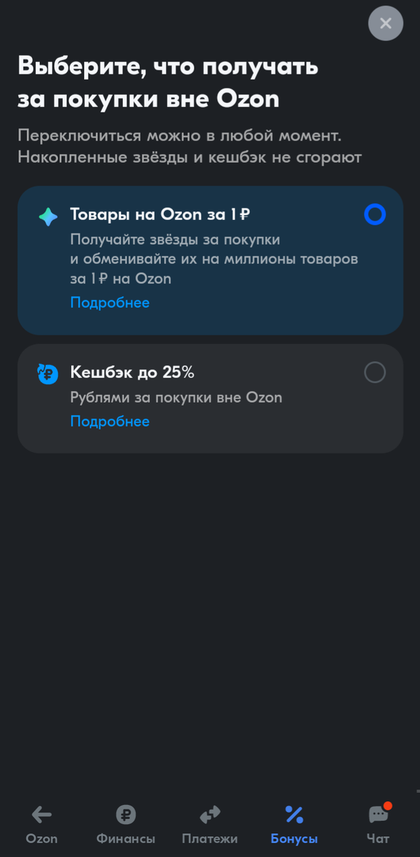 Всем привет!, а вы знали что на озоне есть возможность заказать любой товар за 1 рубль!. Для этого потребуется всего зайти в личный кабинет в приложении Озон, и в разделе Банк, изменить программу лояльности с кешбека на "Товары на Ozon за 1 рублю. Далее для удобства использования данной программы при заказе какого либо заказа закажите за одно и карту Озон банк, затем просто пополняйте ее с карты любого другого банка по системе СПБ. Затем при оплате это картой в любом магазине вам будут начисление в виде звёзд, учтите чтоб получить звезду нужно будет потратить с данной карты с начала 2000 рублей, потом сумма траты увеличится до 5000 рублей, то есть когда вы потратите (оплатите покупки в любом магазине на эту сумму, вам начислят звездочки). И после того как вам зачислятся звезды, вы переходите в раздел "Товары за 1 рубль" и с помощью фильтра можете выбирать нужную категорию товаров и выбрать что вам нужно, оплата товара будет происходит этими звездами и плюс один рубль с вашей карты. Оче