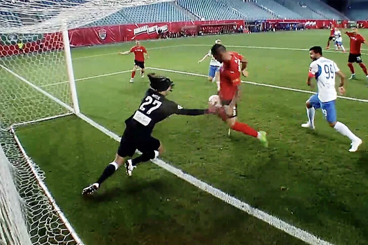 Главный кадр матча Химки - Динамо Махачкала. Антон Заболотный за 0,5 секунды до того, как сравнять.