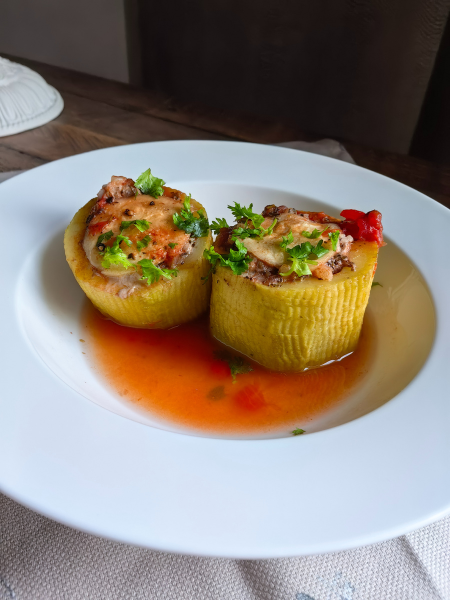 Полученным фаршем начинить кабачки, накрыть "крышечками".