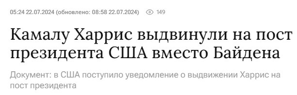 Горячая новость "с пылу с жару". Всеми горячо любимый Джо Байден покидает президентскую гонку в США, а вместо него кандидатом от демократической партии выдвигается нынешний вице-президент Камала Харрис. Как требует законодательство, она уже покинула пост вице-президента, чтобы выдвигаться на президентские выборы. Это вот такая вот дама, ей 59 лет. Я не являюсь политическим обозревателем, вообще не слежу за политикой в США и в ней не разбираюсь, поэтому хочу прокомментировать данную новость как обыватель. Я имею очень слабое представление о том, кто такая Камала Харрис, каковы ее взгляды и достижения, какой может быть ее предвыборная программа, какие шаги она может реализовывать, если станет президентом, и т.д. Но на вопрос "является ли она лучшим кандидатом, чем Байден?" я бы ответил так: любой другой кандидат от демократической партии являлся бы лучшим, чем Байден. И она, конечно же, тоже. Я вообще за молодых президентов. Поэтому среди двух предыдущих кандидатов (Байден и Трамп) мне п