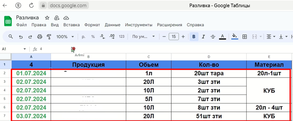 4. После этого начальник склада сохраняет текущих документ «Технологическая операция», а в гугл таблице в колонке «Дата» выделяет дату зеленым цветом: