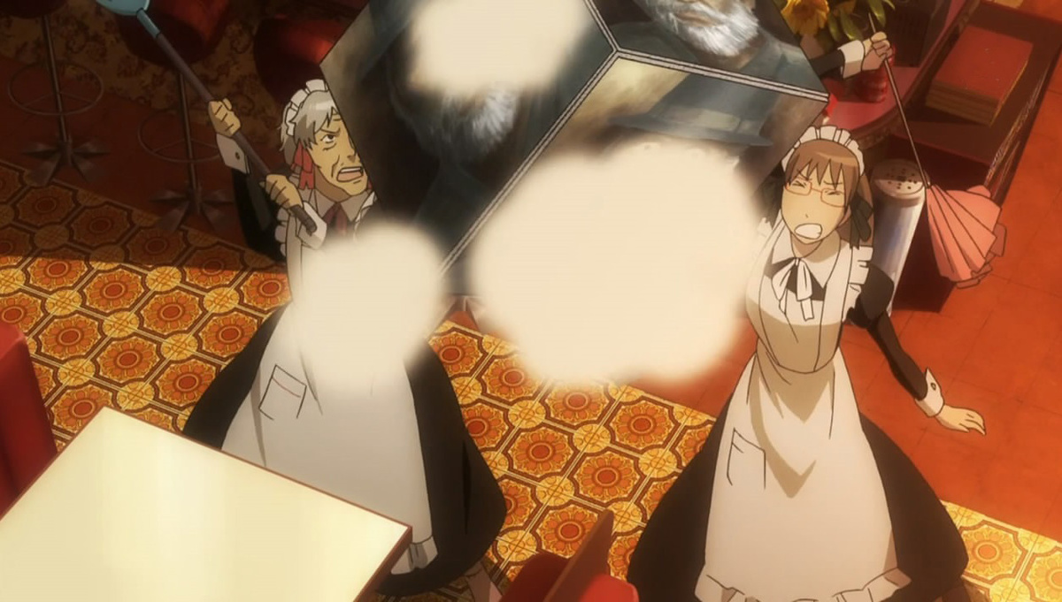 И именно на фоне того, как в промежутках между этим они будут мило обслуживать клиентов и создавало потрясающий контраст пародии. Авторы этого аниме постарались сделать всё, что в их силах, чтобы вы не забывали, что между нами не отморозки из якудза, а милые девочки горничные, даже когда они стреляют друг другу по ногам.