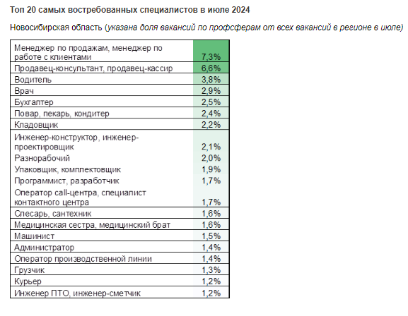 Согласно анализу онлайн-ресурса hh.ru, в июле 2024 года в Новосибирской области наибольший спрос среди работодателей наблюдается на менеджеров по продажам и работе с клиентами, продавцов-консультантов, продавцов-кассиров и водителей. Менеджеры по продажам имеют самый широкий выбор вакансий, составляющих 7,3 % от общего числа предложений о работе. Их зарплаты варьируют от 68 966 до 126 437 рублей.