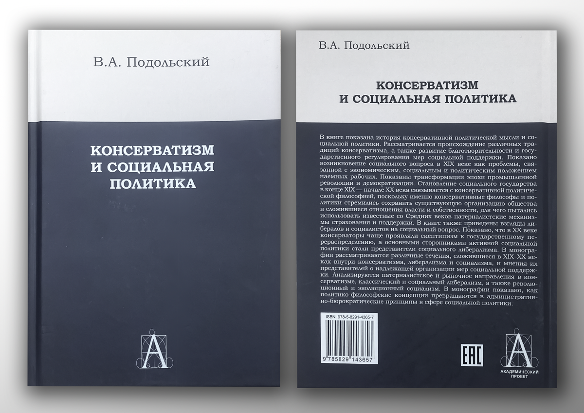 Сегодня мы побеседовали с Вадимом Андреевичем Подольским, к.полит.н., научным сотрудником сектора истории политической философии Института философии РАН, автором книги «Консерватизм и социальная политика». Вадим Андреевич исследует предпосылки возникновения и ход развития политической философии консерватизма, выделяет два направления консерватизма, патерналистское и либеральное, и анализирует исторический опыт становления социального государства, показывая читателю успешные примеры реализации консервативных принципов в социальной политике. В книге оценивается влияние консервативной политической философии на социальную политику различных стран, включая Британию, Германию, Францию, Испанию, США и Россию.