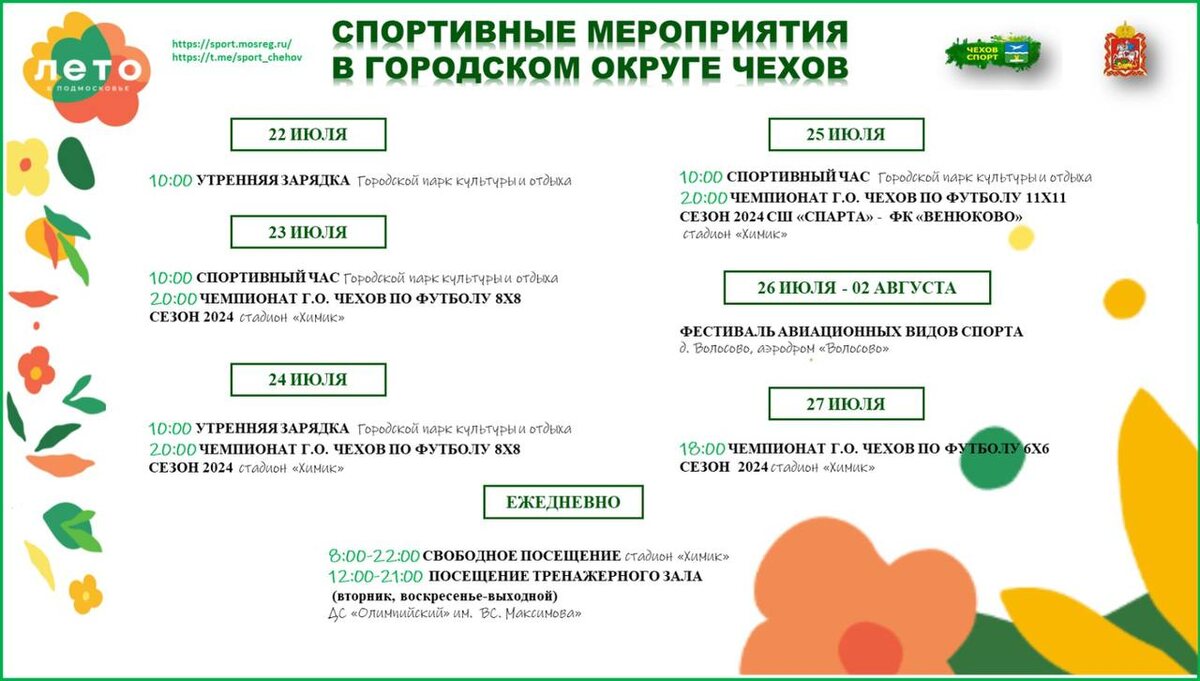 Афиша спортивных мероприятий городского округа Чехов с 22 по 28 июля.