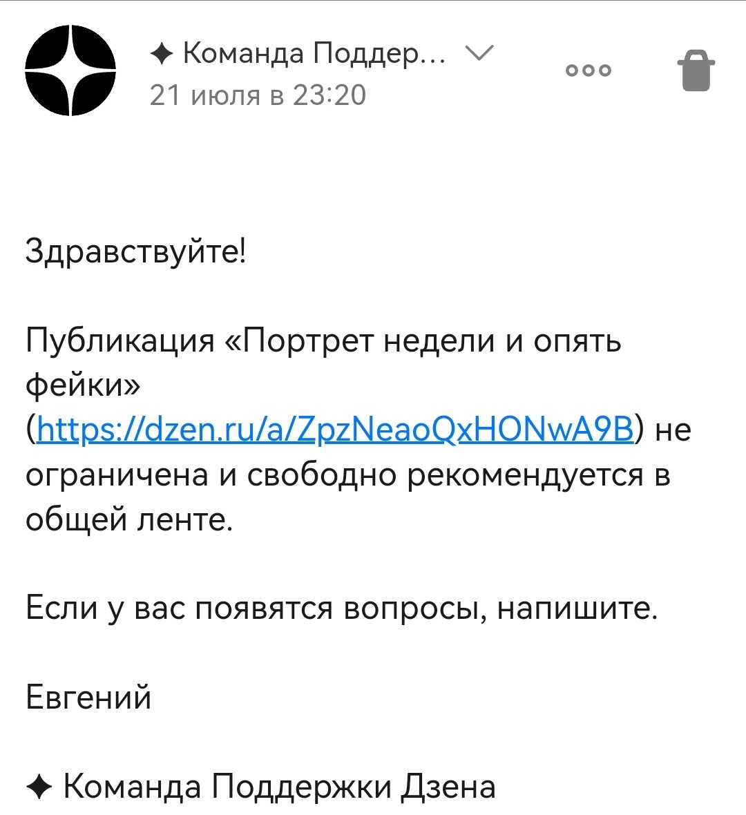 Такой вывод я сделала после общения с поддержкой) Народ, а давайте проведём эксперимент? (о нем ниже) Я ж вчера обнаружила фейки, которая распространяет платформа и модераторы, о чем написала в этой статье Почему именно модераторы распространяют? А фейки продолжают существовать после моей жалобы, значит модераторы, проверив их, не заблокировали. В принципе, я этого и добивалась для обращения в органы, не суть. Суть в другом. У моей статьи на вчерашний вечер было.... 48 показов. Сорок восемь! Повторила прописью, чтоб вы поняли, что это именно двузначное число без нулей. Нет, статья не ограничена😁, но.... В общем, я решила пополнить свою копилку ответов модераторов и спросила, что за фигня с показами Переписка: Я, конечно, рада, что статья не ограничена, но И волшебный ответ модератора Златы Я смеялалась, честно))) но написала То есть, русским языком говоря у фейка успешная подача материала и судя по всему модератор Злата третьим глазом увидела, что автор фейка общается со своими чи