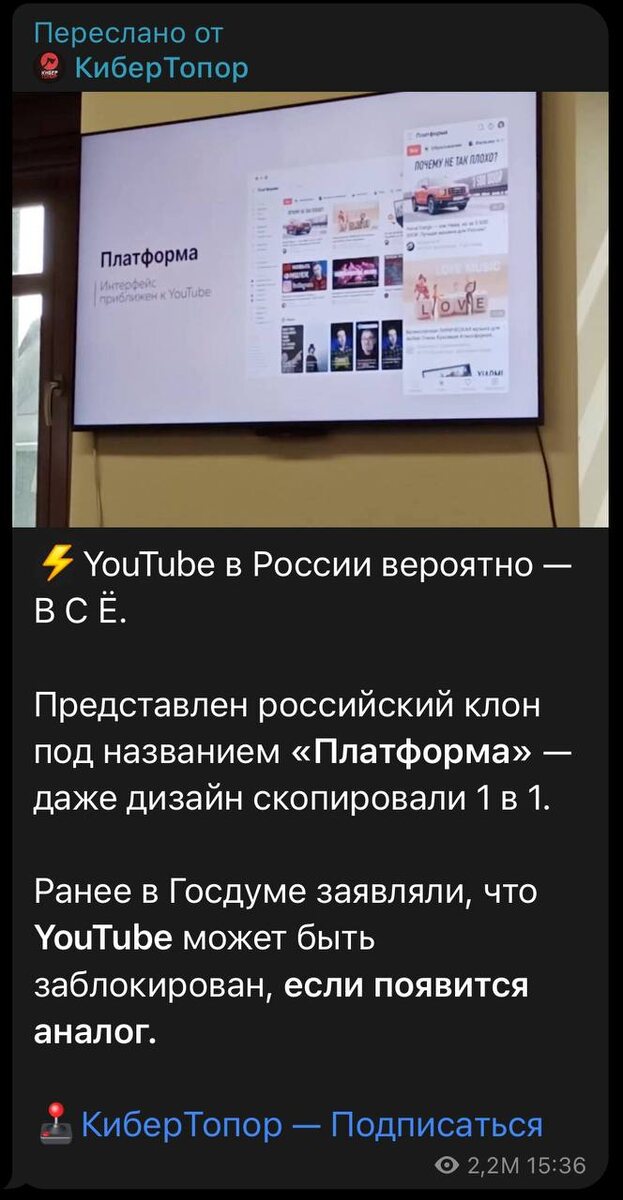 Автору этого заголовка из поста со скрина стоит выдать премию, потому что он какую-то фантастическую шумиху поднял. Эту «новость» мне прислали несколько раз за день, её активно обсуждали в профильных чатах. Комично, что эту самую Платформу найти через поисковик не получилось, так что вот прямая ссылка всем смельчакам! После 24 февраля 22го года подобные новости о закрытии YT в России выходят каждый месяц. И за эти 2 года ровным счётом ничего не поменялось - площадка открыта и работает прекрасно. Для пользователей она и вовсе стала лучше, ведь пропала реклама! И знаете почему я думаю, что YouTube в России не заблокируют ещё очень долго? Потому что именно им пользуется ну очень много людей. Уверен, что ваши мамы-папы-бабушки-дедушки там ищут какие-нибудь рецептики, советы по прикормке огурцов и обзор на блёсны для ловли щуки. Именно эта зарубежная площадка массово принята многими жителями страны. И именно её блокировку заметило бы большинство. YT существует уже почти 20 лет - вы представ