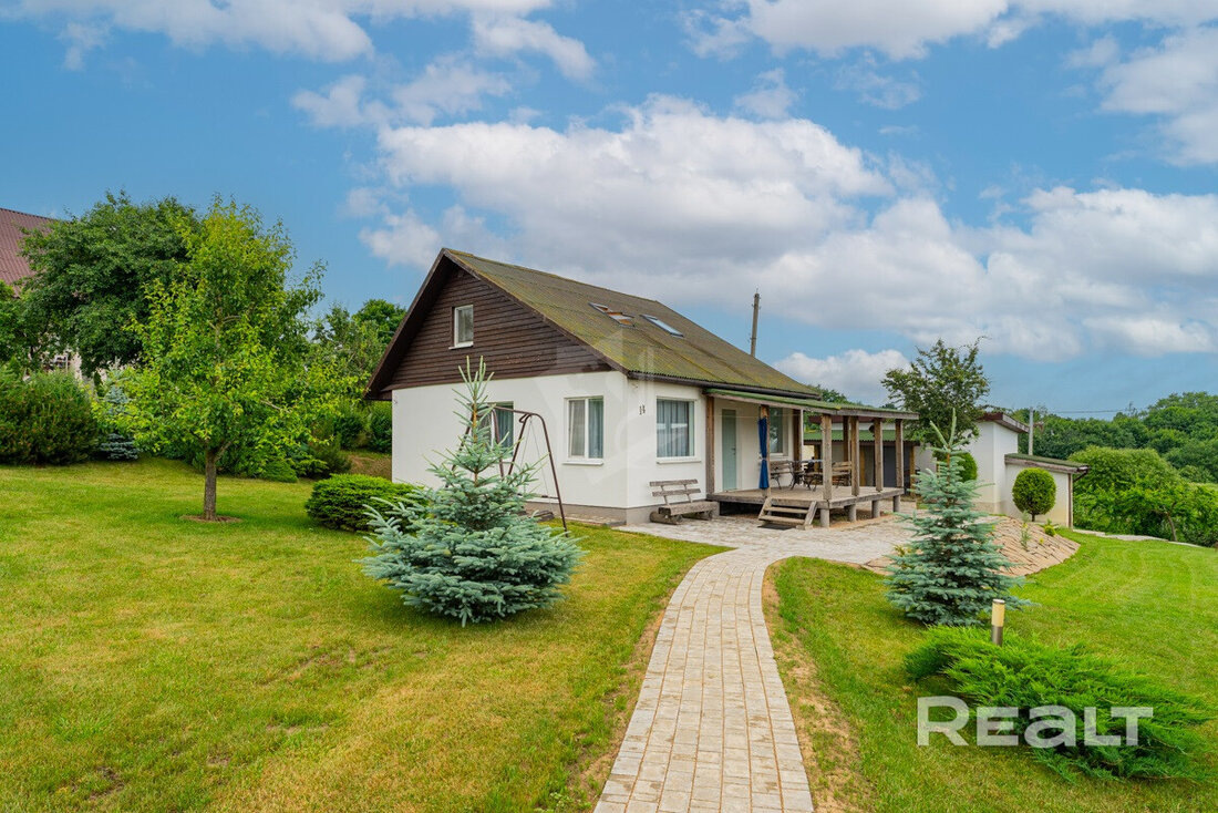 В поселке рядом с Минском продается дом для жизни и ухоженным участком. В доме два этажа, введены все необходимые коммуникации. На территории есть даже баня и погреб. Приятным бонусом является наличие рядом двух водоемов, что являются частью прекрасного вида, который открывается с окон и террасы. Посмотрите, как выглядит дом и сколько за него просят. Дом находится в поселке Черняховский, что в Логойском районе. Его построили в два этажа из бревен в 2013 году. Фундамент тут проточный. Фасад обшит ГВЛ. Крышу устелили ондулином. Площадь дома — 90 квадратных метров. В доме обустроена небольшая прихожая, имеется кухня-гостиная. На первом этаже разместились санузел и одна спальня. К дому прилегает терраса, где открывается живописный вид на воду. Внутри все комнаты обставлены мебелью и бытовой техникой, что останутся здесь и после продажи. В окнах стоят стеклопакеты. По всему дому сделан теплый пол. На мансардном этаже разместились две изолированные комнаты. Тут установлены мансардные окна. С