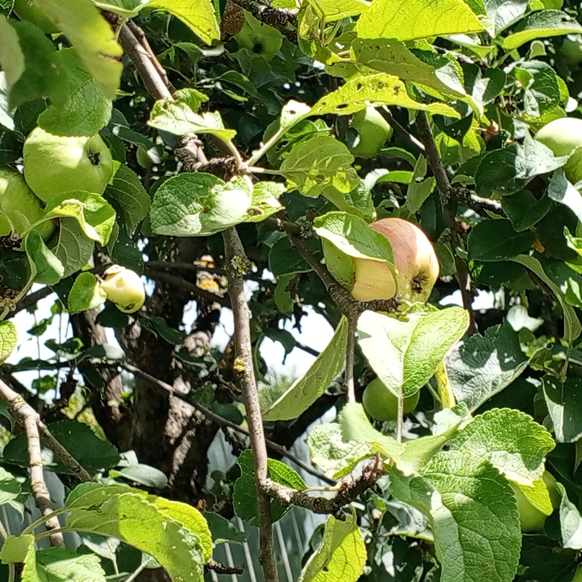 Погодные условия в этом году, мягко говоря, неважные. Яблоки то есть, но падают. Летние сорта - белый налив и московская грушовка мелкие и червивые. Даже не хочется фотографировать. Такая же проблема с сортом корич полосатый. Может быть, Богатырь осенью порадует, если весь не опадет Для ребёнка немного яблочек на колоновидных будет В прошлом году одна колоновидная яблонька больше плодов дала, чем в этом году обе. Груши почти нет Ндааа....