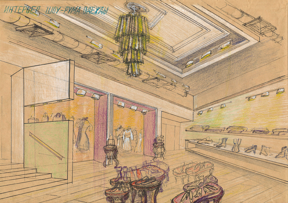 Интерьер бутика одежды в Москве. В рисунке главное это настроение будущего интерьера. Современный стиль с несколькими элементами "классики". В этом интерьере люстра по мотивам Арт-деко будет формировать все пространство и настроение.