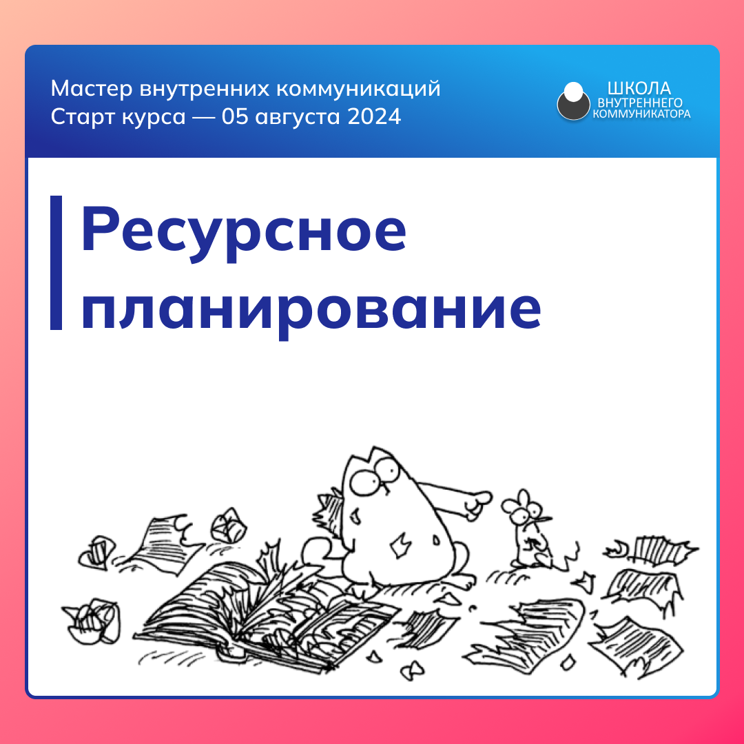 Прежде чем приступать к работе над проектом, вы должны предусмотреть все, что вам потребуется в ходе его реализации. Сколько людей будет задействовано, какое потребуется оборудование и какой будет затрачен бюджет. Этот процесс называется «Ресурсное планирование» – определение, распределение и управление ресурсами для достижения целей проекта. Его основными этапами являются: Подробнее о том, как управлять ресурсами во внутрикоме, говорим на курсе «Мастер внутренних коммуникаций». Вы научитесь эффективно использовать имеющиеся ресурсы и достигать целей проектов в срок и в рамках бюджета. Старт курса – 05 августа. Почитать подробнее и записаться можно по ссылке: