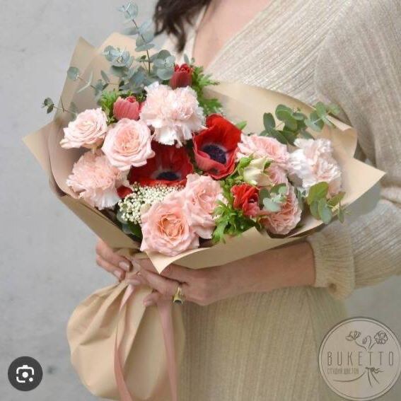 Внимательно посмотрите на фотографию выше и давайте разбираться, что же входит в этот букет и как его можно повторить в зефирном варианте! 🌸 7 средних по размеру роз + можно добавить еще 1 небольшую розочку в угол с эвкалиптом Выполняем в любой технике. Можно использовать стандартную насадку 127. Оттенок светлый розово-персиковый. Для него — смешиваем розовый/красный + желтый + капелька коричневого или можно использовать краситель «Розовый леденец» от Топ-декор. Сердцевину слегка припыляем персиковым распылителем (при желании) 🌸 1 ветка из 3 бутонов роз Цвет молочный: капелька желтого+ капелька коричневого или краситель «Айвори» 🌸 3 гвоздики Цветочки более крупные, чем роза. Оттенок аналогичный розе, но более светлый. Можно использовать насадку 124к или 126к. 🌸 Анемоны 2-3 крупных цветка в центр и 3 полузакрытых Сердцевина черная, можно дополнительно присыпать маком для фактуры. Лепестки красные. Можно при отсадке лепестков в мешок заложить два цвета: по нижнему краю насадки немног