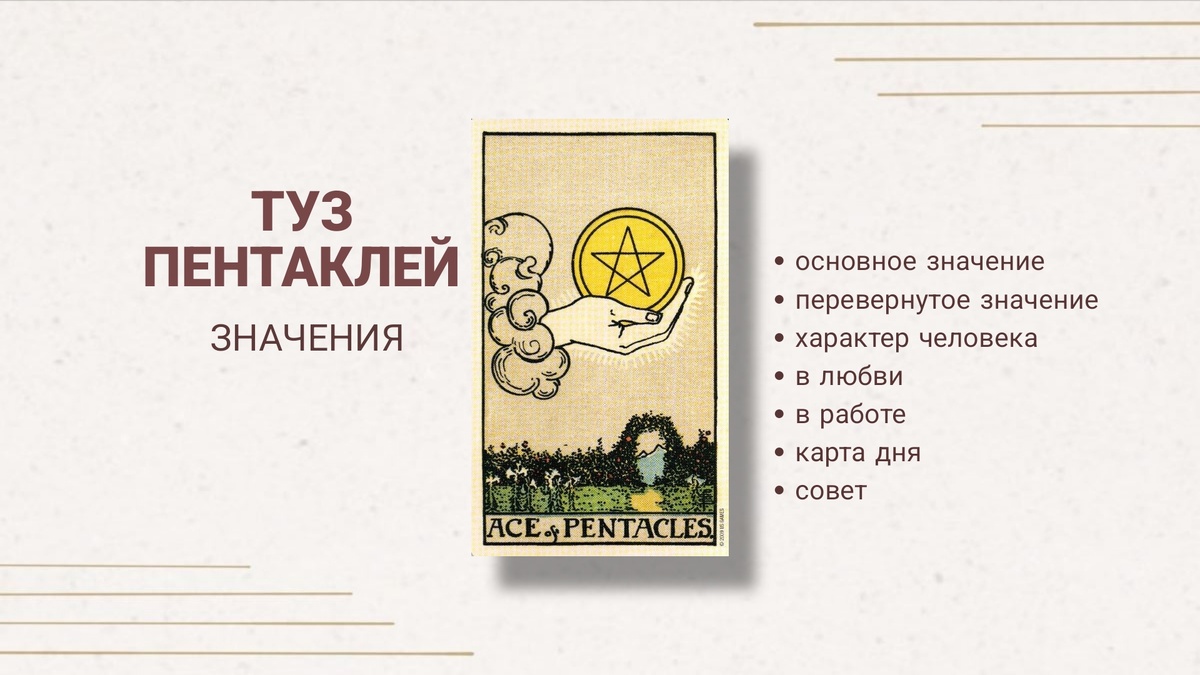 Туз Пентаклей одна из самых перспективных карт в таро. Значения её могут быть не только материальными, но и духовными, хотя конечно в ней больше земного проявления. Рассмотрим в статье самые основные значения этой карты и начнем символов изображенных на ней: