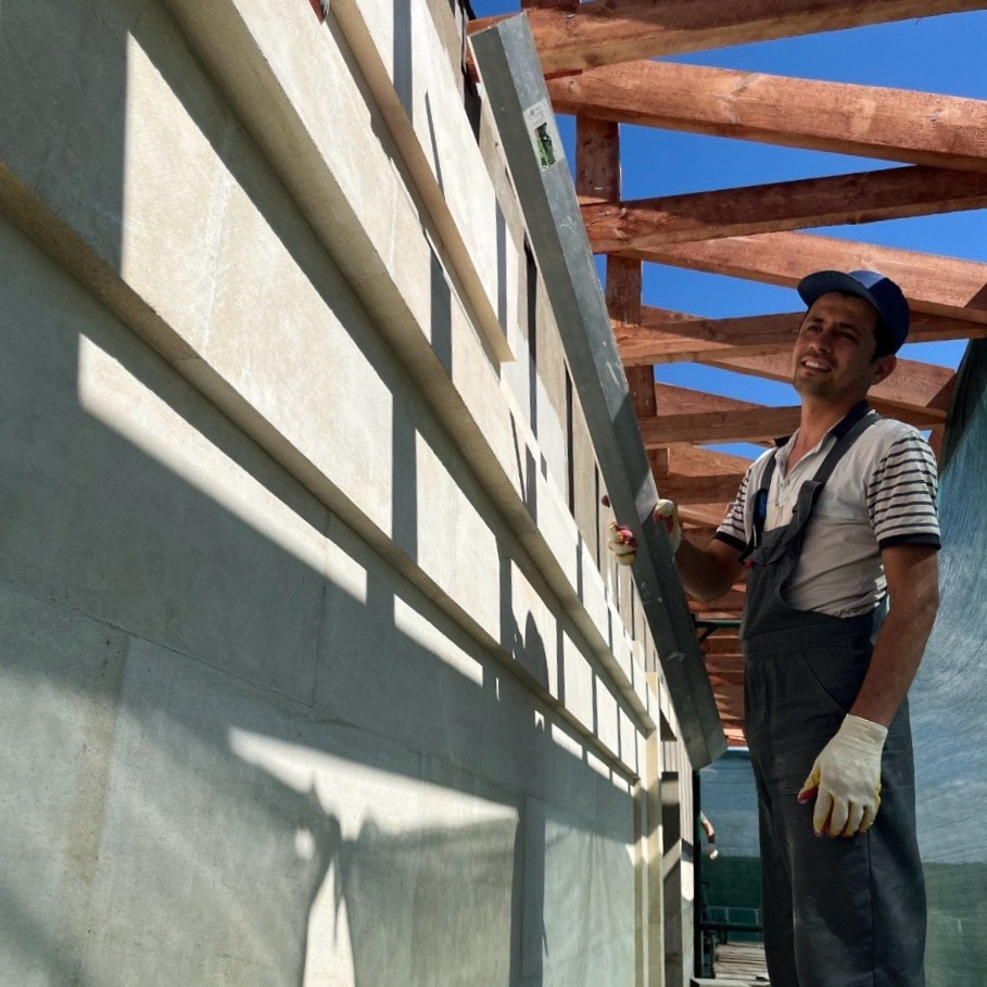 Мы уже оштукатурили фасад и заканчиваем облицовку плиткой из натурального Дагестанского песчаника. Приклеиваем ее на клей Perfekta «Хардфикс». Он устойчив к сползанию, обладает высокой прочностью и подходит для любых оснований.
