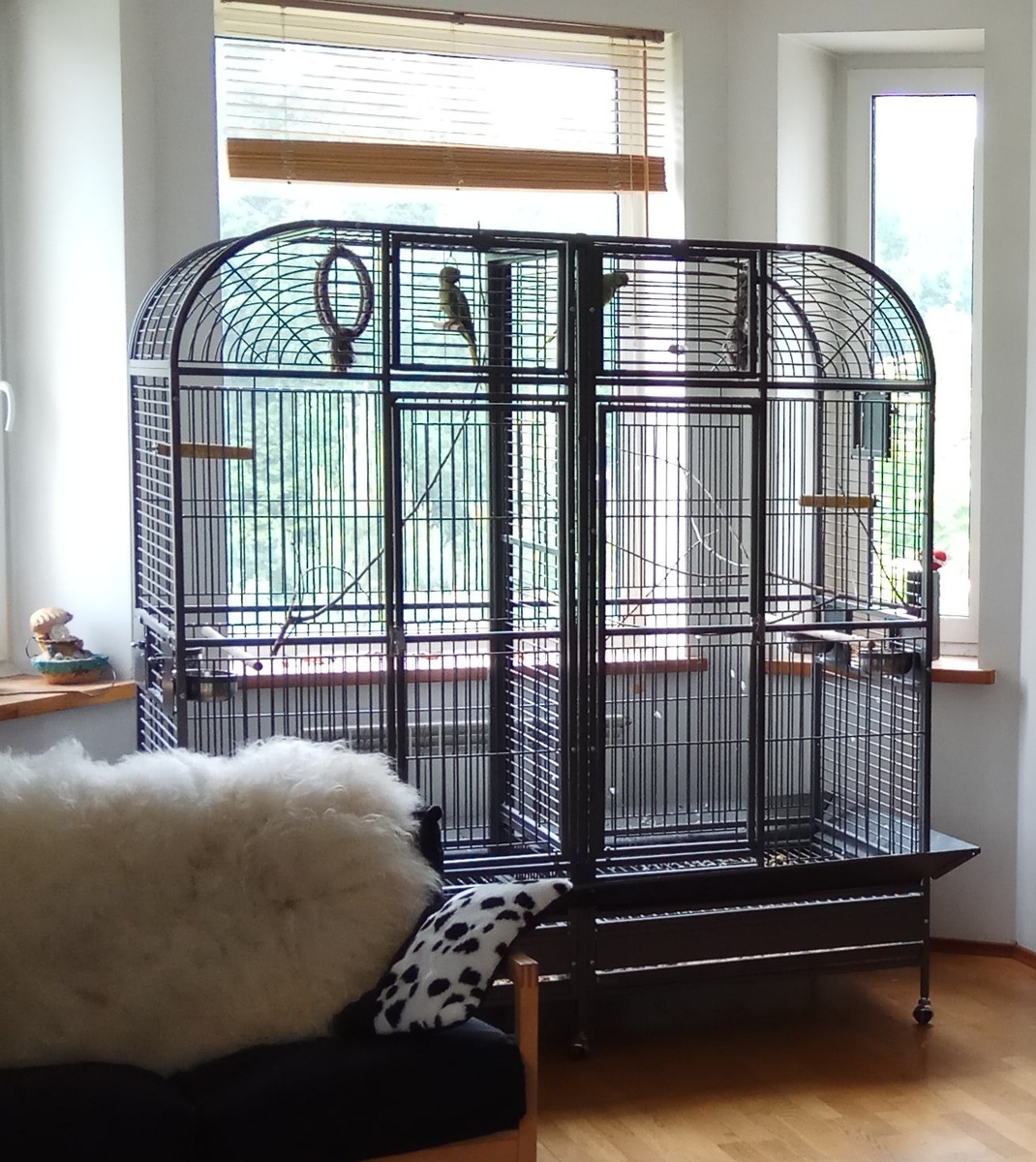 У меня живёт ожереловый попугай, к которому добавился второй - вот после этой истории. Жили они оба в каких-то мелких клетках, что вызывало неудовольствие у потомков динозавров и желание выделить им жилплощадь побольше, при том, что жить в комнате не вариант - загаживают всю комнату - поэтому взгляд остановился на вольере, вот таком: