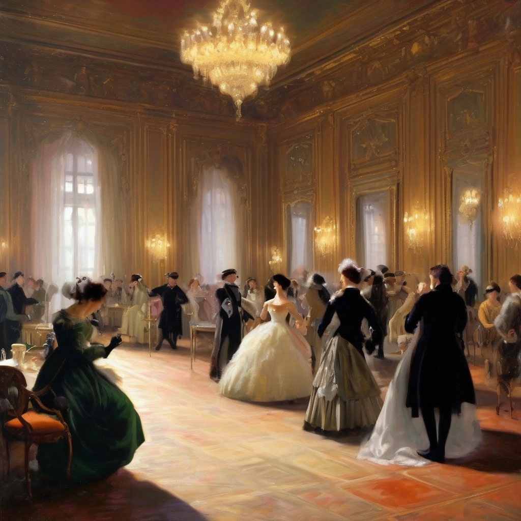 Выйдя из полумрака библиотеки, где тени книг и мягкий свет свечей создавали камерную обстановку, Ольга Александровна оказалась в коридоре, наполненном приглушенными звуками вечернего светского собрания. Легкий шелест платьев, отголоски музыки и смеха, доносящиеся из гостиной, казалось, создавали иллюзию спокойствия, но внезапно её внимание привлекли приглушенные голоса, звучащие из-за массивной двери одного из кабинетов.