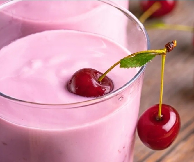 1. Берём блендер, в него кладём вишню и творог, немного молока и сахар по вкусу.