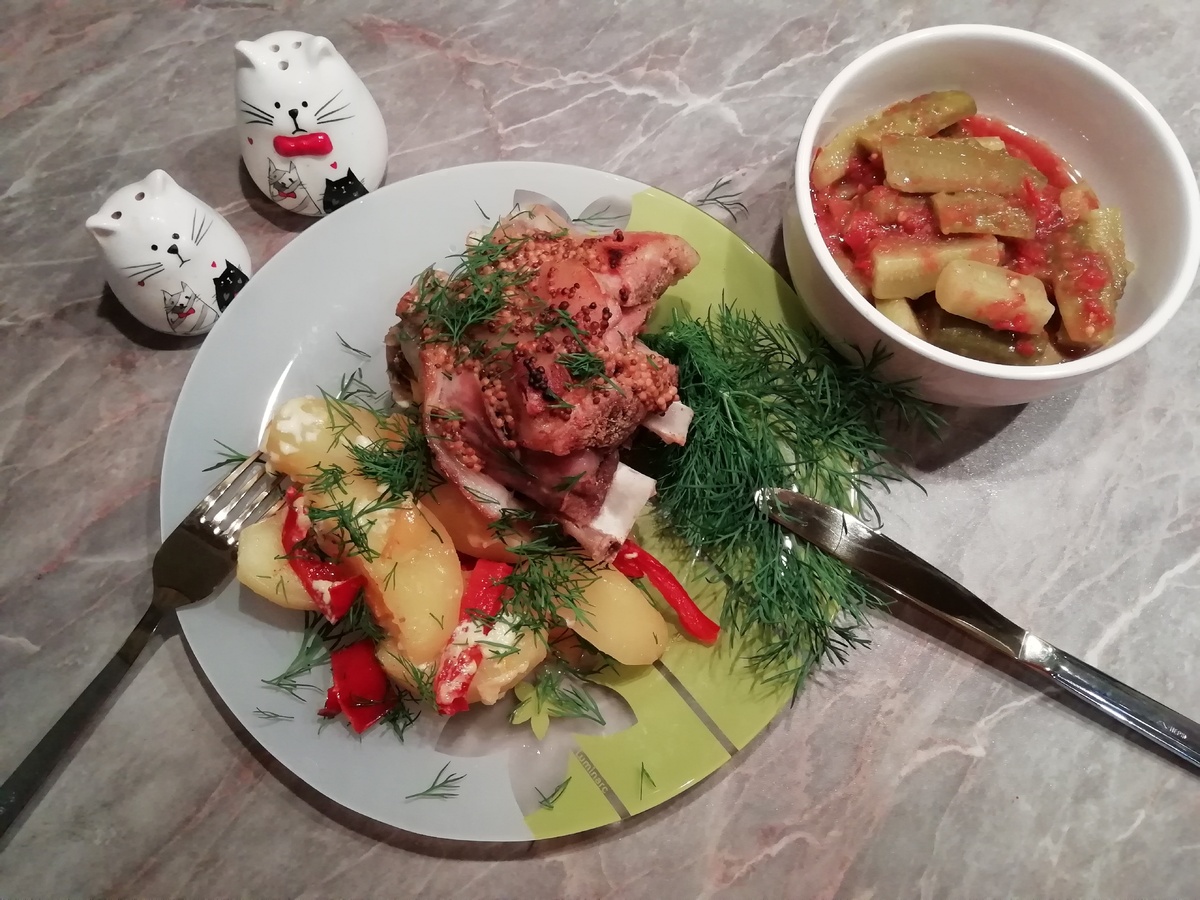 Почистим и нарежем удобными кусочками картофель, посолим, добавим специи (у меня сегодня копчёная паприка и сушёный чеснок). В форму для запекания выложим отваренные рульки, картофель, болгарский перец. Закроем фольгой и отправим в духовку минут на 30 при температуре 200°С. По прошествии 30-40 минут снимем фольгу, смажем рульку зерновой горчицей и ещё минут 10 подержим в духовке. Ароматная рулька и запечённая картошечка с перчиком готовы. Можно