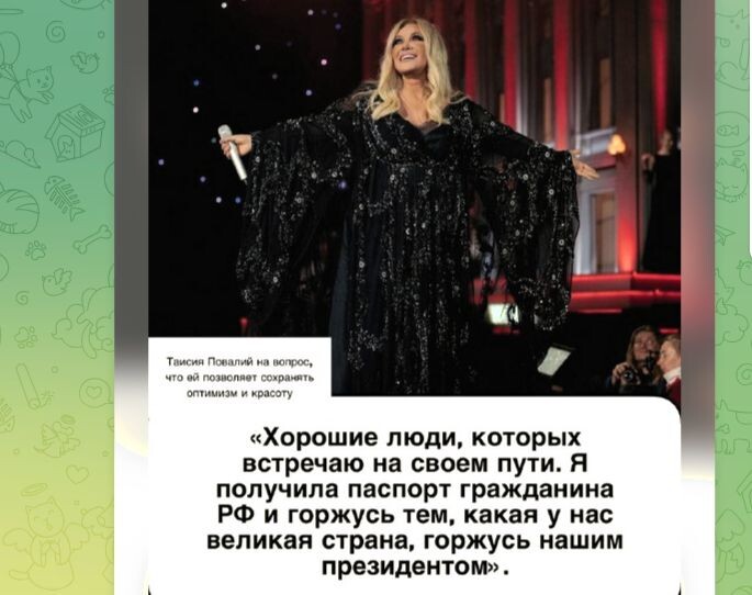 59-летняя Таисия Повалий - популярная советская, в прошлом украинская, а ныне российская певица, народная артистка Ингушетии. В прошлом - Народная артистка Украины (в 2015 году Повалий лишили звания официально). В нынешнее время является гражданкой Российской Федерации. Таисия Николаевна родилась и выросла в Киевской области, в небольшой деревне Шамраевка. Знаменитость признаётся, что любит Украину и скучает по родным местам, живописной природе, родным и близким, которые там остались. Помнит своё деревенское детство, бабушку, с которой пела песни: "Моё детство - деревня, песни и птицы. Мы с мамой и бабушкой постоянно пели песни, у нас был отличный ансамбль." Таисия Повалий часто исполняет на концертах украинские песни, часто говорит, что мечтает о мире на Украине. Но не скрывает пророссийскую позицию: "Я люблю Украину, но Россию тоже! Сегодня я с Россией." Принимала участие в президентских выборах, часто говорит, что гордится, что живёт в РФ, поддерживает действие российских военных,