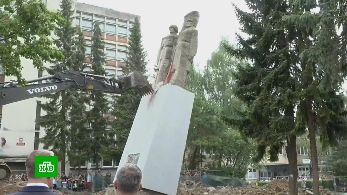 [ Смотреть видео на сайте НТВ ] В Польше продолжают уничтожать памятники советским солдатам. На этот раз жертвой стал монумент советско-польскому братству по оружию. Сначала они содрали звезду со шлема советского солдата, потом повесили новую табличку и облили красной краской, а теперь и вовсе сносят монумент. Памятник ведь не может им ничем ответить. Он просто молча гибнет, как погибли 600 тысяч советских солдат, освобождавших Польшу. Так стирается из памяти советско-польское братство по оружию, в честь которого и был установлен в 1972 году снесенный теперь монумент. Памятник советско-польскому братству по оружию в Новогарде еще долго продержался. Другие памятники поляки снесли со зверским энтузиазмом еще раньше. По всей стране с землей сравняли 450 монументов советским воинам из 560. И все это со словами о декоммунизации и под лозунгами борьбы с пропагандой Советского Союза. Карол Навроцкий, председатель Института национальной памяти: «Они, коммунисты, лишили нас возможности развиват