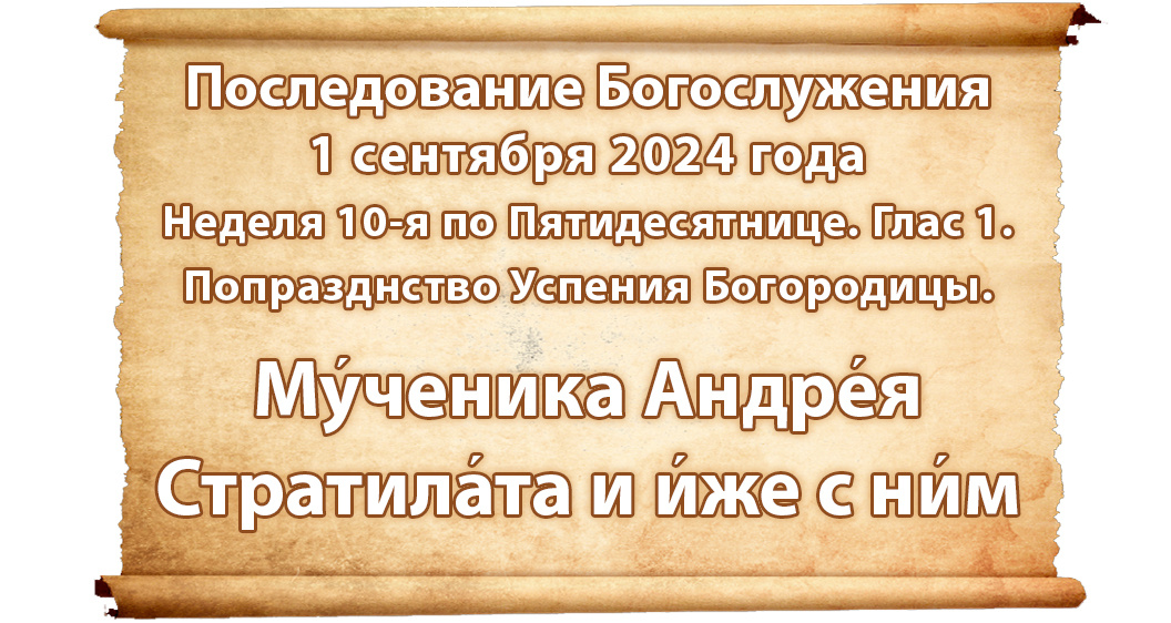 По ссылке на страницу последования богослужения можно скачать в разных форматах службу на 1 сентября́ 2024 го́да. Неде́ля 10-я по Пятидеся́тнице. Попра́зднство Успе́ния Пресвято́й Богоро́дицы. Мч. Андре́я Стратила́та и и́же с ним. Глас 1. Резервная страница проекта: https://posledovanie.my1.ru/index/0-2 Телеграм канал проекта https://t.me/posledovanie/ Телеграм чат https://t.me/ChatPosledovanie Поддержать Последование: молитвой, репостом, добрым словом или материально: http://posledovanie.ru/pomoshch-saytu/