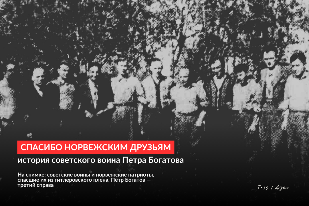 Дорогая редакция! Увидел в «Правде» от 14 июня фотографию шести русских воинов, которых вызволили из плена норвежские патриоты. В газете говорилось, что на снимке второй справа — Дмитрий Черкасов, но не было сказано, кто первый справа. Должен сообщить, что на фотографии первый справа — это я, Пётр Богатов, один из тех, кого, рискуя жизнью, спасли норвежские друзья.