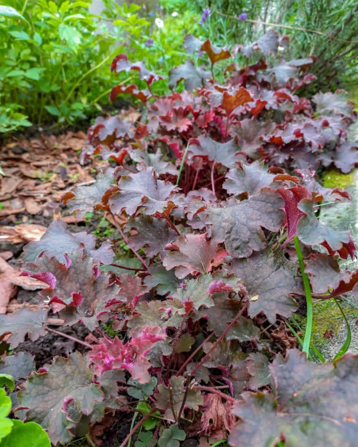 Я в этом сезоне окончательно влюбюлась в гейхеры! Весной разделила старенький куст и пересадила вдоль бордюра. Они достаточно быстро набрали объём! Очень порадовали. Единственное, не цвели. Но это не проблема. Сорт не знаю. В конце июня случайно попалась гейхера «Art Deco» по какой-то смешной стоимости. Отлично прижилась и уже почти месяц цветёт! Малышка «Midnight Rose» пошла в рост. Очень красивые листья! 💜 Надеюсь, в следующем году поразит меня своей пёстрой красотой. Хочется ещё красных оттенков. Пока присматриваюсь. И мой новый опыт - пеларгонии в садовом грунте. Об этом в следующий раз. Разговаривайте с цветами! И они вам ответят.