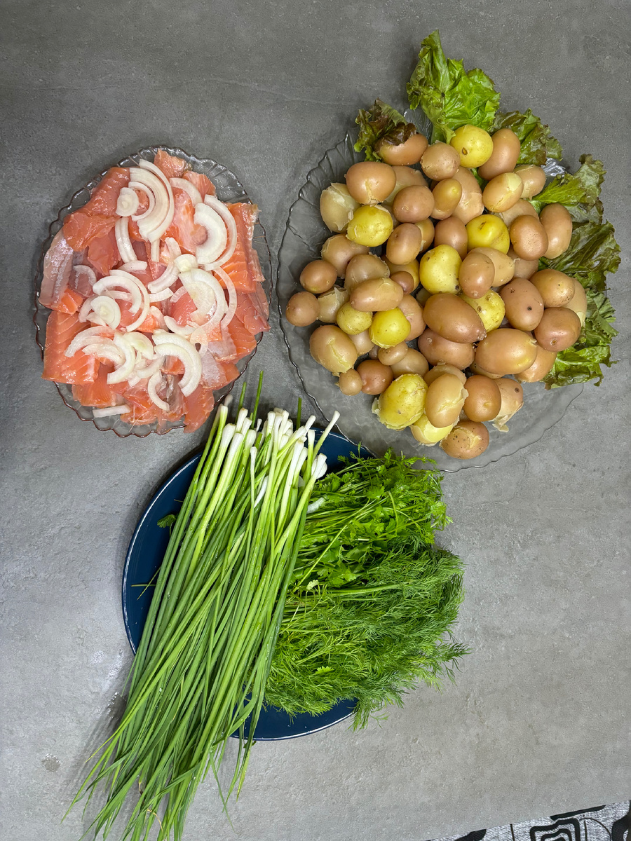 Зеленый лук, укроп, кинза, листья салата, ну и конечно молоденькая картошечка в мундире.