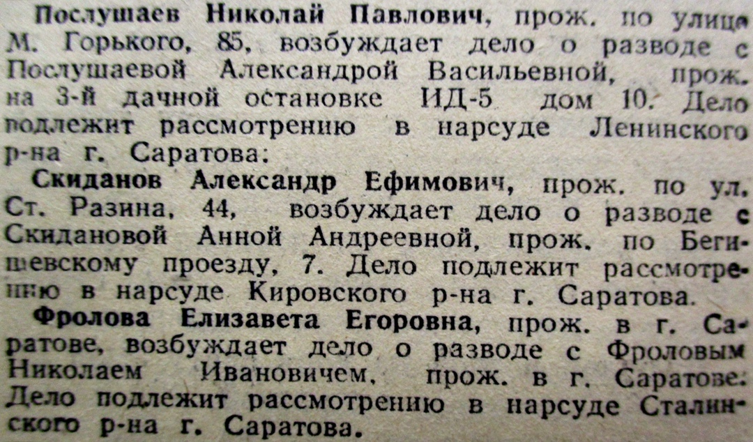 Логично предположить, что информация о разводе должна отложиться в церковных документах. Пометки об этом могут найтись в метрической книге рядом с записью о венчании, причём как в случае развода до 1918 года, так и в более поздние уже советские годы. Связано это с тем, что один экземпляр метрических книг десятилетия после отмены церковных браков хранился в районных ЗАГСах. Главное: найти в областном архиве именно и "загсовский", и "консисторский" экземпляры книг. Рядом с записью указывались номер и дата решения о разводе. Для дореволюционного времени это будет указ Синода, для советского: решение суда. При поисках сведений о разводах советского времени может возникнуть затруднение: необходимость дока