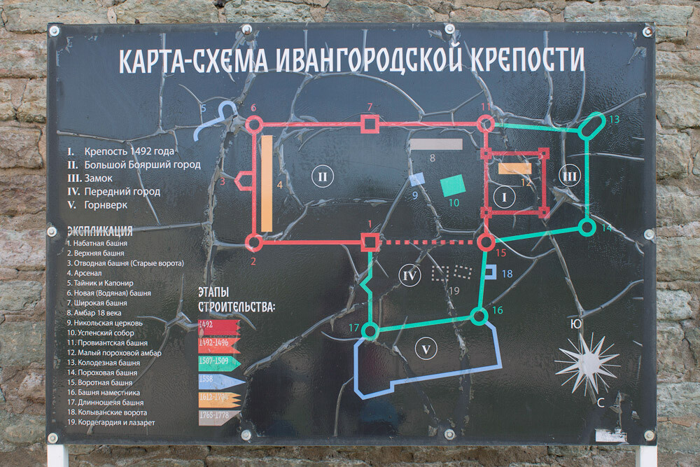 Ивангородская крепость заложена в 1492 году Иваном 3, чье имя и получила, на Девичьей горе, прямо напротив Ливонской крепости 1329 года. Первоначально – вон тот квадратик, отмеченный цифрой I на плане – была очень маленькой, естественно, не вмещала большой гарнизон, и на расстоянии от берега, что помогло шведам с легкостью взять крепость штурмом в 1496.